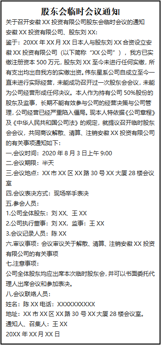 鑒于:20XX年XX月XX日本人與股東劉XX合資設(shè)立安徽XX投資有限公司(以下簡稱“XX公司”),我方已實繳注冊資本500萬元,股東劉XX至今未進(jìn)行任何實繳,所有支出均出自我方的實繳出資。偉東星系公司自成立至今一直未進(jìn)行實際經(jīng)營,未能成功召開過一次股東會會議,未能為公司經(jīng)營形成任何決議。本人作為持有公司50%股份的股東及監(jiān)事,長期不能有效參與公司的經(jīng)營決策與公司管理,公司經(jīng)營已經(jīng)嚴(yán)重陷入僵局,F(xiàn)本人特依據(jù)《公司章程》及《中華人民共和國公司法》的規(guī)定,就提議召開臨時股東會會議,共同商議解散、清算、注銷安徽XX投資有限公司的有關(guān)事項通知如下: