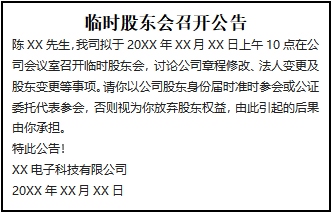 陳XX先生,我司擬于20XX年XX月XX日上午10點(diǎn)在公司會議室召開臨時股東會,討論公司章程修改、法人變更及股東變更等事項。請你以公司股東身份屆時準(zhǔn)時參會或公證委托代表參會,否則視為你放棄股東權(quán)益,由此引起的后果由你承擔(dān)。