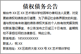 煙臺市牟平區(qū)XX藝術(shù)培訓(xùn)學(xué)校因舉辦者和法人變更,對變更前債權(quán)和債務(wù)進(jìn)行清理,為了保證社會各界朋友的利益,請與我校有未結(jié)清的債務(wù)債權(quán)關(guān)系的個人持有效憑據(jù)到我校聯(lián)系登記事宜,本公告發(fā)布之日起三十日有效,逾期我校不承擔(dān)任何的法律責(zé)任,特此公告。