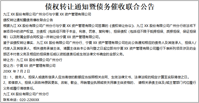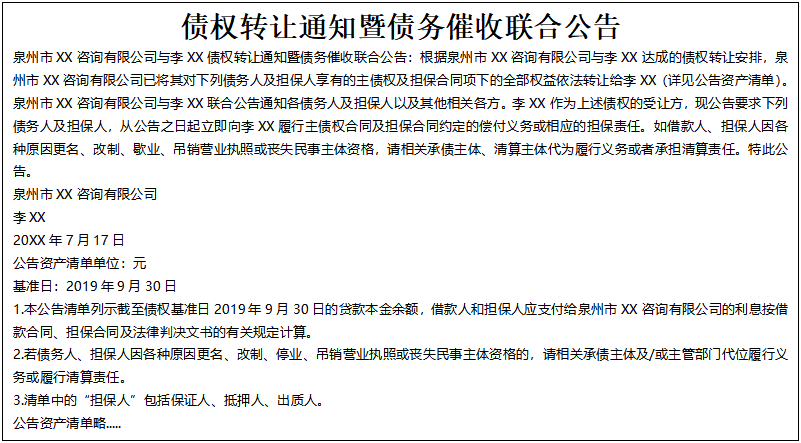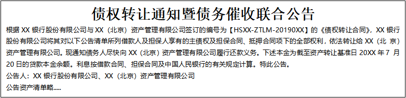 根據(jù)XX銀行股份有限公司與XX(北京)資產(chǎn)管理有限公司簽訂的編號為【HSXX-ZTLM-20190XX】的《債權(quán)轉(zhuǎn)讓合同》,XX銀行股份有限公司將其對以下公告清單所列借款人及擔保人享有的主債權(quán)及擔保合同、抵押合同項下的全部權(quán)利,依法轉(zhuǎn)讓給XX(北 京)資產(chǎn)管理有限公司。現(xiàn)通知債務人盡快向XX(北京)資產(chǎn)管理有限公司履行還款義務。下述本金為截至資產(chǎn)轉(zhuǎn)讓基準日20XX年7 月20日的貸款本金余額。利息按借款合同、擔保合同及中國人民銀行的有關(guān)規(guī)定計算。特此公告。
