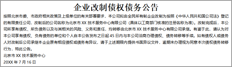 按照北京市委、市政府相關(guān)政策及上級(jí)單位的有關(guān)部署要求,本公司擬由全民所有制企業(yè)改制為按照《中華人民共和國公司法》登記的有限責(zé)任公司,改制后的公司名稱為北京市XX技術(shù)服務(wù)中心有限公司(具體以工商部門核準(zhǔn)的注冊(cè)名稱為準(zhǔn))。改制完成后,本公司所享有債權(quán)、所負(fù)債務(wù)以及與其相關(guān)的風(fēng)險(xiǎn)、義務(wù)和責(zé)任,均轉(zhuǎn)移由北京市XX技術(shù)服務(wù)中心有限公司承繼。有鑒于此,請(qǐng)認(rèn)為對(duì)本公司享有債權(quán)、負(fù)有債務(wù)的單位和個(gè)人自本公告發(fā)布之日起45日內(nèi)與本公司洽商辦理債權(quán)、債務(wù)轉(zhuǎn)移等手續(xù)。如有債權(quán)人或債務(wù)人對(duì)改制后公司承繼本企業(yè)原有相應(yīng)債權(quán)或債務(wù)有異議,請(qǐng)于上述期限內(nèi)提供書面異議文件,逾期未辦理視為同意本次債權(quán)債務(wù)轉(zhuǎn)移行為,特此公告。