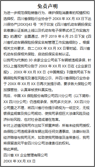 以我司為代表的30余家企業(yè)公司名下車輛被違規(guī)承保,針對(duì)以上情況我司分別于20XX年XX月XX日在《企業(yè)家日?qǐng)?bào)》、20XX年XX月XX日《中國商報(bào)》刊登我司名下車輛保險(xiǎn)購買情況及潛在風(fēng)險(xiǎn)公示,并四川省保險(xiǎn)行業(yè)協(xié)會(huì)于20XX年XX月XX日再次發(fā)提示函,要求各大保險(xiǎn)公司加強(qiáng)管控,認(rèn)真審核資料真實(shí)性。