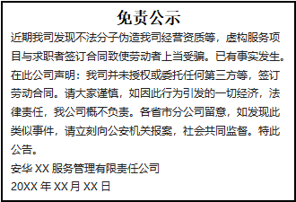 近期我司發(fā)現(xiàn)不法分子偽造我司經(jīng)營資質(zhì)等,虛構(gòu)服務(wù)項(xiàng)目與求職者簽訂合同致使勞動(dòng)者上當(dāng)受騙。已有事實(shí)發(fā)生。