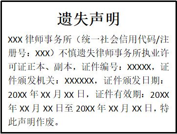 XXX律師事務(wù)所(統(tǒng)一社會(huì)信用代碼/注冊(cè)號(hào):XXX)不慎遺失律師事務(wù)所執(zhí)業(yè)許可證正本、副本,證件編號(hào):XXXXX,證件頒發(fā)機(jī)關(guān):XXXXXX,證件頒發(fā)日期:20XX年XX月XX日,證件有效期:20XX年XX月XX日至20XX年XX月XX日,特此聲明作廢。