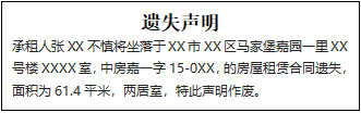 承租人張XX不慎將坐落于XX市XX區(qū)馬家堡嘉園一里XX號(hào)樓XXXX室,中房嘉一字15-0XX,的房屋租賃合同遺失,面積為61.4平米,兩居室,特此聲明作廢。