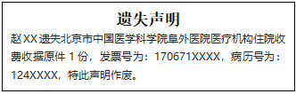 趙XX遺失北京市中國醫(yī)學科學院阜外醫(yī)院醫(yī)療機構住院收費收據(jù)原件1份,發(fā)票號為:170671XXXX,病歷號為:124XXXX,特此聲明作廢。