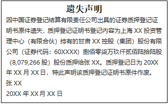 因中國證券登記結(jié)算有限責(zé)任公司出具的證券質(zhì)押登記證明書原件遺失,質(zhì)押登記證明書登記內(nèi)容為上海XX投資管理中心(有限合伙)持有的甘肅XX控股(集團(tuán))股份有限公司(證券代碼:60XXXX)捌佰零柒萬玖仟貳佰陸拾陸股(8,079,266股)股份質(zhì)押給張XX。質(zhì)押登記日為20XX年XX月XX日,特此聲明該質(zhì)押登記證明書原件作廢。
