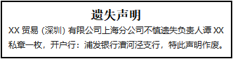 XX貿(mào)易(深圳)有限公司上海分公司不慎遺失負(fù)責(zé)人譚XX私章一枚,開戶行:浦發(fā)銀行漕河涇支行,特此聲明作廢。