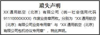 XX通用航空(北京)有限公司(統(tǒng)一社會(huì)信用代碼91110000XXXX)作廢業(yè)務(wù)章兩枚。分別為“XX通用航空(北京)有限公司業(yè)務(wù)專用章”與“XX通用航空(北京)有限公司包機(jī)協(xié)議專用章”,特此聲明。
