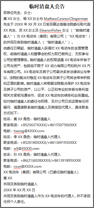 由委任日期起,臨時(shí)清盤人獲得對XX電動車的全面管理權(quán),前臨時(shí)清盤人和董事會的權(quán)力即已被終止,無權(quán)參與公司的管理事務(wù)。臨時(shí)清盤人的權(quán)限涵蓋XX電動車所有子公司與資產(chǎn),包括但不限于XX動力有限公司和杭州XX汽車有限公司。XX電動車及其子公司牽涉多宗法律訴訟與爭議,法院的裁決對穩(wěn)定XX電動車及其子公司將會帶來積極和正面的影響。臨時(shí)清盤人將根據(jù)法院裁決保護(hù)XX電動車及其子公司的資產(chǎn),以公平、公正和專業(yè)的宗旨與各利益相關(guān)方緊密溝通合作,促進(jìn)XX電動車的債務(wù)和業(yè)務(wù)重組。如對臨時(shí)清盤人的委任與權(quán)限,及對公司日后運(yùn)營有任何疑問,請直接聯(lián)系臨時(shí)清盤人及其指定代理人,具體聯(lián)系方式如下: