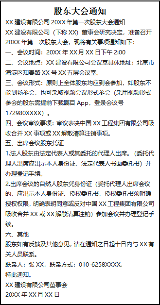 四、會(huì)議審議事項(xiàng):審議表決中國(guó)XX工程集團(tuán)有限公司吸收合并XX事項(xiàng)或XX解散清算注銷事項(xiàng)。