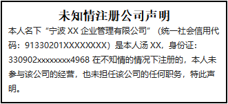 本人名下“寧波XX企業(yè)管理有限公司”(統(tǒng)一社會信用代碼:91330201XXXXXXXX)是本人湯XX,身份證:330902xxxxxxxx4968在不知情的情況下注冊的,本人未參與該公司的經(jīng)營,也未擔(dān)任該公司的任何職務(wù),特此聲明。