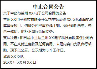 支隊(duì)決定:即日起中止與蘭州XX電子科技有限責(zé)任公司合同,不在支付進(jìn)度款及任何費(fèi)用,未建內(nèi)容由支隊(duì)自行采購。現(xiàn)予以公示,公示期為5個(gè)工作日。