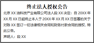 北京XX油科技產(chǎn)業(yè)有限公司法人段XX決定:自20XX年XX月XX日起終止本人于20XX年XX月XX日簽署的關(guān)于對陳XX簽訂一切法律相關(guān)合同和財務付款合同的授權(quán),特此公告。