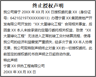 我公司曾于20XX年XX月XX日授權(quán)委托袁XX(身份證號(hào):642102197XXXXXX613)辦理寧夏XX集團(tuán)房地產(chǎn)開發(fā)有限公司開發(fā)的“XX大廈綠化工程”合同相關(guān)事宜,后因袁XX本人未按承諾約定履行委托相關(guān)權(quán)益,致使“XX大廈綠化工程”無法進(jìn)入正常的竣工交付結(jié)算流程,使得我公司的經(jīng)濟(jì)利益蒙受嚴(yán)重?fù)p失,經(jīng)多次于袁XX本人協(xié)商無果,我公司現(xiàn)特別聲明終止對(duì)袁XX的一切授權(quán)委托,此前簽定的授權(quán)委托書自聲明之日起自動(dòng)作廢。