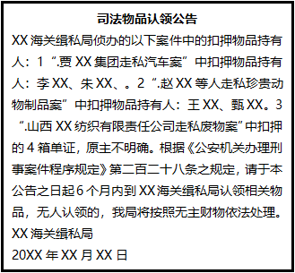 XX海關緝私局偵辦的以下案件中的扣押物品持有人:1“.賈XX集團走私汽車案”中扣押物品持有人:李XX、朱XX、。2“.趙XX等人走私珍貴動物制品案”中扣押物品持有人:王XX、甄XX。3“.山西XX紡織有限責任公司走私廢物案”中扣押的4箱單證,原主不明確。根據(jù)《公安機關辦理刑事案件程序規(guī)定》第二百二十八條之規(guī)定,請于本公告之日起6個月內(nèi)到XX海關緝私局認領相關物品,無人認領的,我局將按照無主財物依法處理。