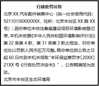北京XX汽車配件銷售中心(統(tǒng)一社會信用代碼:92110106XXXXXX,住所:北京豐臺區(qū)XX路XX號):因你單位未依法備案建設(shè)項目環(huán)境影響登記表,本機(jī)關(guān)依據(jù)《中華人民共和國環(huán)境影響評價法》第22條第4款、第31條第3款之規(guī)定,對你單位處以罰款人民幣伍萬元整。限你單位自公告之日起60日內(nèi)到本機(jī)關(guān)領(lǐng)取“豐環(huán)保監(jiān)察罰字〔20XX〕21XX號《行政處罰決定書》”,公告期滿視為送達(dá)。