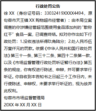 徐XX(身份證號碼:33032419XXXX4494,原句容市天王鎮(zhèn)XX購物超市經(jīng)營者):由本局立案調(diào)查的你涉嫌經(jīng)營超范圍使用食品添加劑的“散稱紅干”食品一案,已調(diào)查終結(jié)。擬對你作出如下行政處罰:1.沒收違法所得玖角陸分;2.處人民幣伍萬壹仟元的罰款。依據(jù)《中華人民共和國行政處罰法》第三十一條、第三十二條、第四十二條第一款,以及《市場監(jiān)督管理行政處罰聽證暫行辦法》第五條的規(guī)定,你有權(quán)進(jìn)行陳述、申辯,并可要求舉行聽證。你自收到本告知書之日起三個工作日內(nèi),未行使陳述、申辯權(quán),未要求舉行聽證的,視為放棄此權(quán)利。