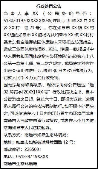因無法與你取得聯(lián)系,現(xiàn)依法向你公告送達(dá)“通02環(huán)罰字[20XX]1XX號”行政處罰決定書,自本公告發(fā)出之日起,經(jīng)過六十日,即視為送達(dá),逾期仍未履行義務(wù)的將依法強(qiáng)制執(zhí)行。如不服本處罰決定,可以依法在六十日內(nèi)向江蘇省生態(tài)環(huán)境廳或者南通市人民政府申請行政復(fù)議,或者在六個月內(nèi)依法向如皋市人民法院起訴。
