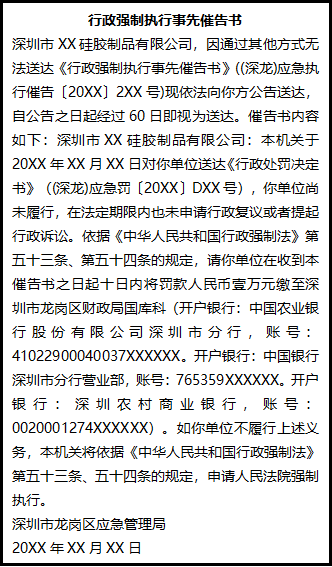 深圳市XX硅膠制品有限公司,因通過其他方式無法送達(dá)《行政強(qiáng)制執(zhí)行事先催告書》((深龍)應(yīng)急執(zhí)行催告〔20XX〕2XX號)現(xiàn)依法向你方公告送達(dá),自公告之日起經(jīng)過60日即視為送達(dá)。催告書內(nèi)容如下:深圳市XX硅膠制品有限公司:本機(jī)關(guān)于20XX年XX月XX日對你單位送達(dá)《行政處罰決定書》((深龍)應(yīng)急罰〔20XX〕DXX號),你單位尚未履行,在法定期限內(nèi)也未申請行政復(fù)議或者提起行政訴訟。依據(jù)《中華人民共和國行政強(qiáng)制法》第五十三條、第五十四條的規(guī)定,請你單位在收到本催告書之日起十日內(nèi)將罰款人民幣壹萬元繳至深圳市龍崗區(qū)財政局國庫科(開戶銀行:中國農(nóng)業(yè)銀行股份有限公司深圳市分行,賬號:41022900040037XXXXXX。開戶銀行:中國銀行深圳市分行營業(yè)部,賬號:765359XXXXXX。開戶銀行:深圳農(nóng)村商業(yè)銀行,賬號:0020001274XXXXXX)。如你單位不履行上述義務(wù),本機(jī)關(guān)將依據(jù)《中華人民共和國行政強(qiáng)制法》第五十三條、五十四條的規(guī)定,申請人民法院強(qiáng)制執(zhí)行。