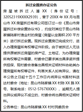 房屋被拆遷人潘XX(身份證號:32052319XXXX2939),曾于20XX年XX月與昆山市XX房屋拆遷有限公司簽訂過一份《昆山市房屋拆遷補償安置協(xié)議書》,約定對其位于昆山市陸家鎮(zhèn)陸家村漁業(yè)村的房屋(房屋認定面積200平方米)進行拆遷安置,F(xiàn)拆遷安置房已完成交付,進入辦理房屋所有權(quán)等證件階段。由于被拆遷人無法提供原被拆遷房屋的房產(chǎn)證、土地證,為辦理房屋所有權(quán)等證件需要,村委會已要求其出具承諾并提供擔保,現(xiàn)村委會準備出具相關(guān)證明材料協(xié)助其辦理房屋所有權(quán)等證件,利害關(guān)系人如有異議,請在本公告之日起十五個工作日內(nèi)將異議書面材料送達村委會(地址:昆山市陸家鎮(zhèn)XX村陳XX路XX號,聯(lián)系電話:0512-5767XXXX),逾期無人提出異議或異議不成立的,村委會將出具相關(guān)證明材料。