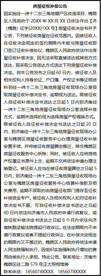 因?qū)嵤┙?jīng)一緯十二東三角地棚戶區(qū)改造項目,槐蔭區(qū)人民政府于20XX年XX月XX日依法作出【濟(槐蔭)征字[20XX]1XX號】房屋征收決定書并予公告,下列被征收房屋在征收范圍內(nèi)。因被征收人在征收決定規(guī)定的簽約期限內(nèi)未能與房屋征收部門簽訂征收補償協(xié)議,槐蔭區(qū)人民政府依法作出房屋征收補償決定,因無法采取直接送達或其他方式送達,現(xiàn)采取公告送達方式送達下列房屋征收補償決定。自本公告發(fā)布之日起60日內(nèi),被征收人及相關(guān)權(quán)利人持身份證、戶口簿、產(chǎn)權(quán)證書等證明資料到經(jīng)一緯十二東三角地房屋征收現(xiàn)場辦公室領(lǐng)取房屋征收補償決定書,逾期視為送達。限被征收人自征收補償決定書送達之日起5日內(nèi)到濟南經(jīng)一緯十二東三角地房屋征收現(xiàn)場辦公室選擇補償方式,逾期未選擇的視為選擇房屋產(chǎn)權(quán)調(diào)換方式。限被征收人自征收補償決定書送達之日起20日內(nèi),到濟南經(jīng)一緯十二東三角地房屋征收現(xiàn)場辦公室與槐蔭區(qū)房屋征收服務(wù)中心辦理房屋征收補償安置手續(xù),并將被征收房屋騰空搬遷,移交槐蔭區(qū)房屋征收服務(wù)中心拆除;同時,被征收人應(yīng)將房地產(chǎn)權(quán)屬證書原件上交,逾期不交將依法申請辦理注銷登記。被征收人應(yīng)當在被征收房屋騰空之日起5日內(nèi),到濟南經(jīng)一緯十二東三角地房屋征收現(xiàn)場辦公室與槐蔭區(qū)房屋征收服務(wù)中心結(jié)算補償款及相關(guān)費用,逾期不領(lǐng)取的由房屋征收部門提存至征收補償資金專戶。被征收人及相關(guān)權(quán)利人如對征收補償決定書不服,可自征收補償決定書送達之日起60日內(nèi)依法向濟南市人民政府申請行政復議,或自征收補償決定書送達之日起6個月內(nèi)依法向濟南鐵路運輸法院提起行政訴訟。在法定期限內(nèi)不申請行政復議或者不提起行政訴訟,在補償決定規(guī)定的期限內(nèi)又不搬遷的,槐蔭區(qū)人民政府將依法申請人民法院強制執(zhí)行,因組織實施強制執(zhí)行增加的費用由被執(zhí)行人承擔。特此公告。聯(lián)系地址:濟南市槐蔭區(qū)經(jīng)二路579號正大照相館旁