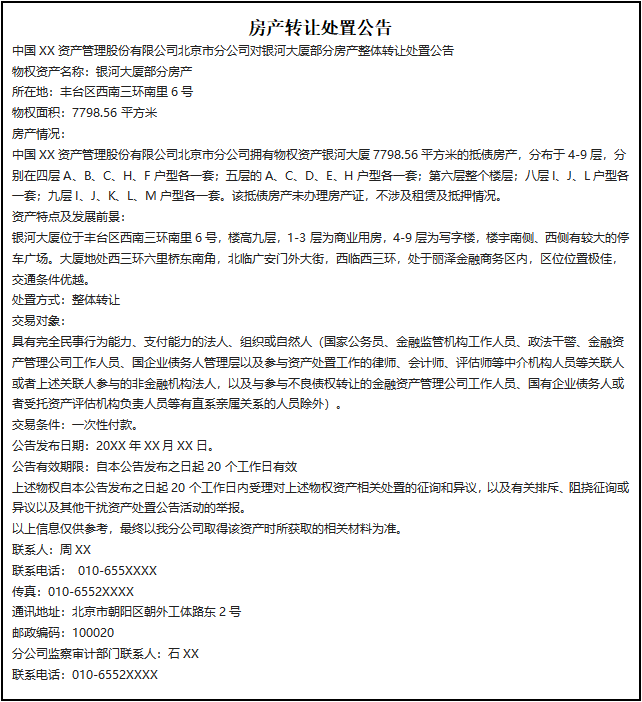 中國XX資產(chǎn)管理股份有限公司北京市分公司對(duì)銀河大廈部分房產(chǎn)整體轉(zhuǎn)讓處置公告
