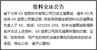 鑒于北京XX信息技術(shù)有限公司已成立清算組,請(qǐng)宋XX先生將XX信息公司章證照、財(cái)務(wù)賬冊(cè)等全部資料交還清算組負(fù)責(zé)人于XX,電話:6252XX-2XX。如未與清算組取得聯(lián)系并交還上述資料,XX信息公司因無(wú)清算所需的印章、證照、財(cái)務(wù)賬冊(cè),而產(chǎn)生的相關(guān)法律后果和風(fēng)險(xiǎn)將由您依法承擔(dān),特此公告,請(qǐng)予以重視!
