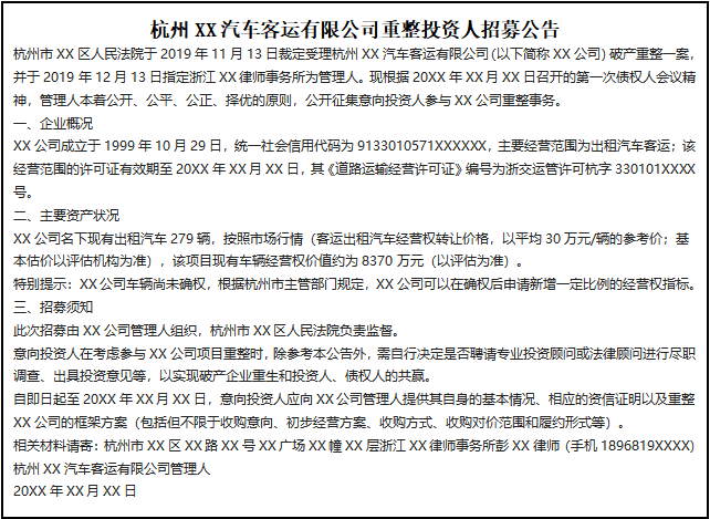 杭州XX汽車客運(yùn)有限公司重整投資人招募公告