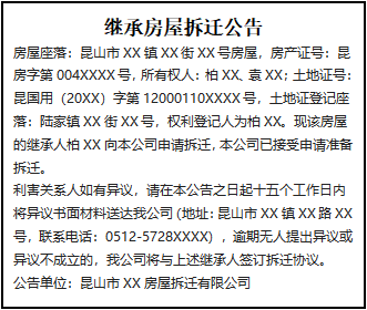 利害關(guān)系人如有異議,請在本公告之日起十五個工作日內(nèi)將異議書面材料送達(dá)我公司(地址:昆山市XX鎮(zhèn)XX路XX號,聯(lián)系電話:0512-5728XXXX),逾期無人提出異議或異議不成立的,我公司將與上述繼承人簽訂拆遷協(xié)議。