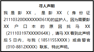我是彭XX,是彭XX(身份證211103200XXXXXX061X)的監(jiān)護人,因為需要彭XX戶口本的原因找馬XX(211103197XXXX064X),請馬XX看到此聲明后5日內(nèi),與我(1851155XXXX)或曲警官(010-8812XXXX)聯(lián)系,特此聲明。