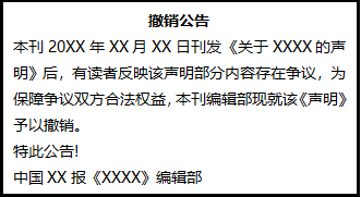 本刊20XX年XX月XX日刊發(fā)《關(guān)于XXXX的聲明》后,有讀者反映該聲明部分內(nèi)容存在爭議,為保障爭議雙方合法權(quán)益,本刊編輯部現(xiàn)就該《聲明》予以撤銷。