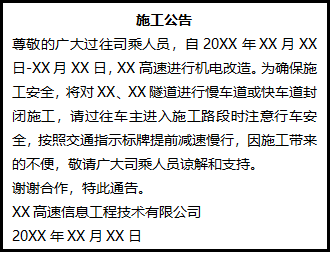 尊敬的廣大過往司乘人員,自20XX年XX月XX日-XX月XX日,XX高速進(jìn)行機(jī)電改造。為確保施工安全,將對(duì)XX、XX隧道進(jìn)行慢車道或快車道封閉施工,請(qǐng)過往車主進(jìn)入施工路段時(shí)注意行車安全,按照交通指示標(biāo)牌提前減速慢行,因施工帶來的不便,敬請(qǐng)廣大司乘人員諒解和支持。