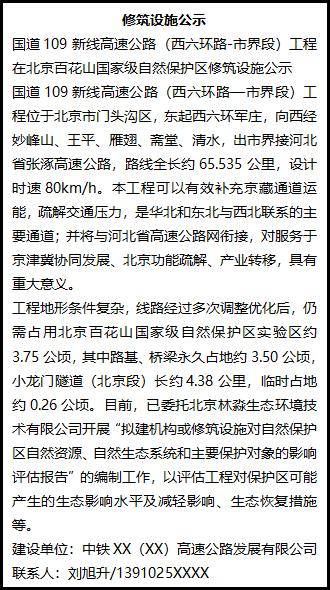 國道109新線高速公路(西六環(huán)路-市界段)工程在北京百花山國家級自然保護區(qū)修筑設(shè)施公示