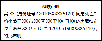 吳XX(身份證號(hào)120105XXXX5120)同意死亡后將坐落于XX市XX區(qū)XX里XX門XX的房屋指定過戶給倪XX(身份證號(hào)120105198XXXX5110),特此聲明。