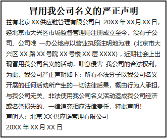茲有北京XX供應(yīng)鏈管理有限公司自 20XX年XX月XX日,經(jīng)北京市大興區(qū)市場監(jiān)督管理局注冊成立至今,沒有子公司、公司唯 一辦公地點以營業(yè)執(zhí)照注明地為準(北京市大興區(qū)XX路XX號院XX號樓XX層XXXX),近期社會上出現(xiàn)冒用我公司名義的活動,肆意侵害 我公司的合法權(quán)利,為此,我公司嚴正聲明如下:所有不法分子以我公司名義開展的任何活動所產(chǎn)生的一切法律后果,概由行為人承擔,與我公司無關(guān)、非法使用我公司名義活動造成我公司經(jīng)濟或名譽損失的,一律追究相應(yīng)法律責任,特此聲明!