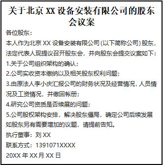 關(guān)于北京XX設(shè)備安裝有限公司的股東會(huì)議案
