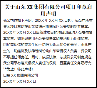 20XX年XX月XX日后新建項(xiàng)目的項(xiàng)目印章均為公安局備案印章,如出現(xiàn)使用無公安局備案印章均視為偽造印章,因加蓋偽造印章發(fā)生的一切行為均與我公司無關(guān),由此產(chǎn)生的一切經(jīng)濟(jì)及法律等糾紛均由印章侵權(quán)人負(fù)責(zé),我公司不承擔(dān)任何責(zé)任。同時(shí),依據(jù)法律、法規(guī)及公司制度規(guī)定我公司享有追究侵權(quán)人責(zé)任的權(quán)利,直至責(zé)任義務(wù)履行完畢為止!特此聲明!