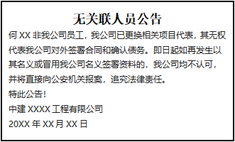 何XX非我公司員工,我公司已更換相關(guān)項(xiàng)目代表,其無(wú)權(quán)代表我公司對(duì)外簽署合同和確認(rèn)債務(wù)。即日起如再發(fā)生以其名義或冒用我公司名義簽署資料的,我公司均不認(rèn)可,并將直接向公安機(jī)關(guān)報(bào)案,追究法律責(zé)任。