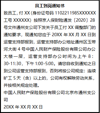 致員工,付XX(身份證號碼1102211985XXXXXX工號XXXXXX)按照京人保財險通發(fā)〔2020〕28號文件通州支公司下發(fā)關(guān)于員工付XX調(diào)整部門的通知要求,現(xiàn)通知您應(yīng)于20XX年XX月XX日到運營支持部報到,運營支持部辦公地址通州區(qū)玉帶河大街4號中國人民財產(chǎn)保險股份有限公司辦公大樓一層,運營支持部辦公時間為上午8:30-11:30,下午1:00-5:00。請您自收到通知之日到公司運營支持部報到,否則將按公司規(guī)定:連續(xù)曠工5天(含)以上的,公司有權(quán)解除勞動關(guān)系,并按相關(guān)規(guī)定處理。