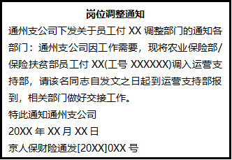通州支公司下發(fā)關(guān)于員工付XX調(diào)整部門的通知各部門:通州支公司因工作需要,現(xiàn)將農(nóng)業(yè)保險部/保險扶貧部員工付XX(工號XXXXXX)調(diào)入運營支持部,請該名同志自發(fā)文之日起到運營支持部報到,相關(guān)部門做好交接工作。