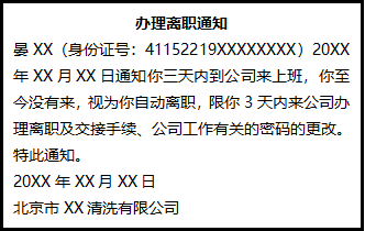 晏XX(身份證號:41152219XXXXXXXX)20XX年XX月XX日通知你三天內(nèi)到公司來上班,你至今沒有來,視為你自動(dòng)離職,限你3天內(nèi)來公司辦理離職及交接手續(xù)、公司工作有關(guān)的密碼的更改。