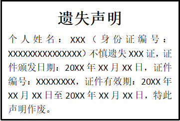 個(gè)人姓名:XXX(身份證編號(hào):XXXXXXXXXXXXXXX)不慎遺失繼續(xù)教育證書(shū),證書(shū)頒發(fā)日期:20XX年XX月XX日,證書(shū)編號(hào):XXXXXXXX,有效期:20XX年XX月XX日至20XX年XX月XX日,特此聲明作廢。