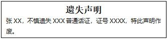 張XX,不慎遺失XXX普通話證,證號XXXX,特此聲明作廢。