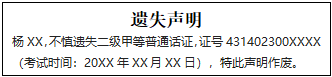 楊XX,不慎遺失二級甲等普通話證,證號431402300XXXX(考試時間:20XX年XX月XX日),特此聲明作廢。