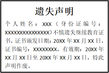 個(gè)人姓名:XXX(身份證編號(hào):XXXXXXXXXXXXXXX)不慎遺失繼續(xù)教育證書(shū),證書(shū)頒發(fā)日期:20XX年XX月XX日,證書(shū)編號(hào):XXXXXXXX,有效期:20XX年XX月XX日至20XX年XX月XX日,特此聲明作廢。