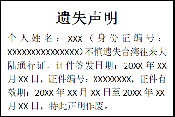 個(gè)人姓名:XXX(身份證編號(hào):XXXXXXXXXXXXXXX)不慎遺失臺(tái)灣往來大陸通行證,證件簽發(fā)日期:20XX年XX月XX日,證件編號(hào):XXXXXXXX,證件有效期:20XX年XX月XX日至20XX年XX月XX日,特此聲明作廢。