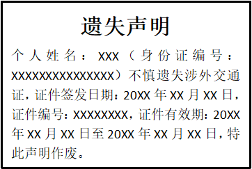 個人姓名:XXX(身份證編號:XXXXXXXXXXXXXXX)不慎遺失涉外交通證,證件簽發(fā)日期:20XX年XX月XX日,證件編號:XXXXXXXX,證件有效期:20XX年XX月XX日至20XX年XX月XX日,特此聲明作廢。